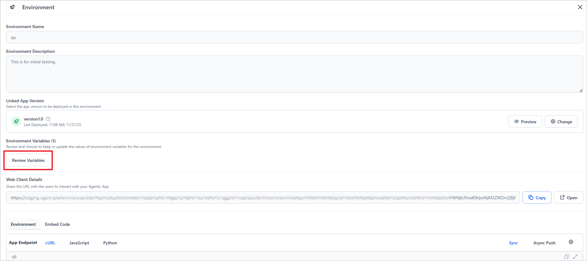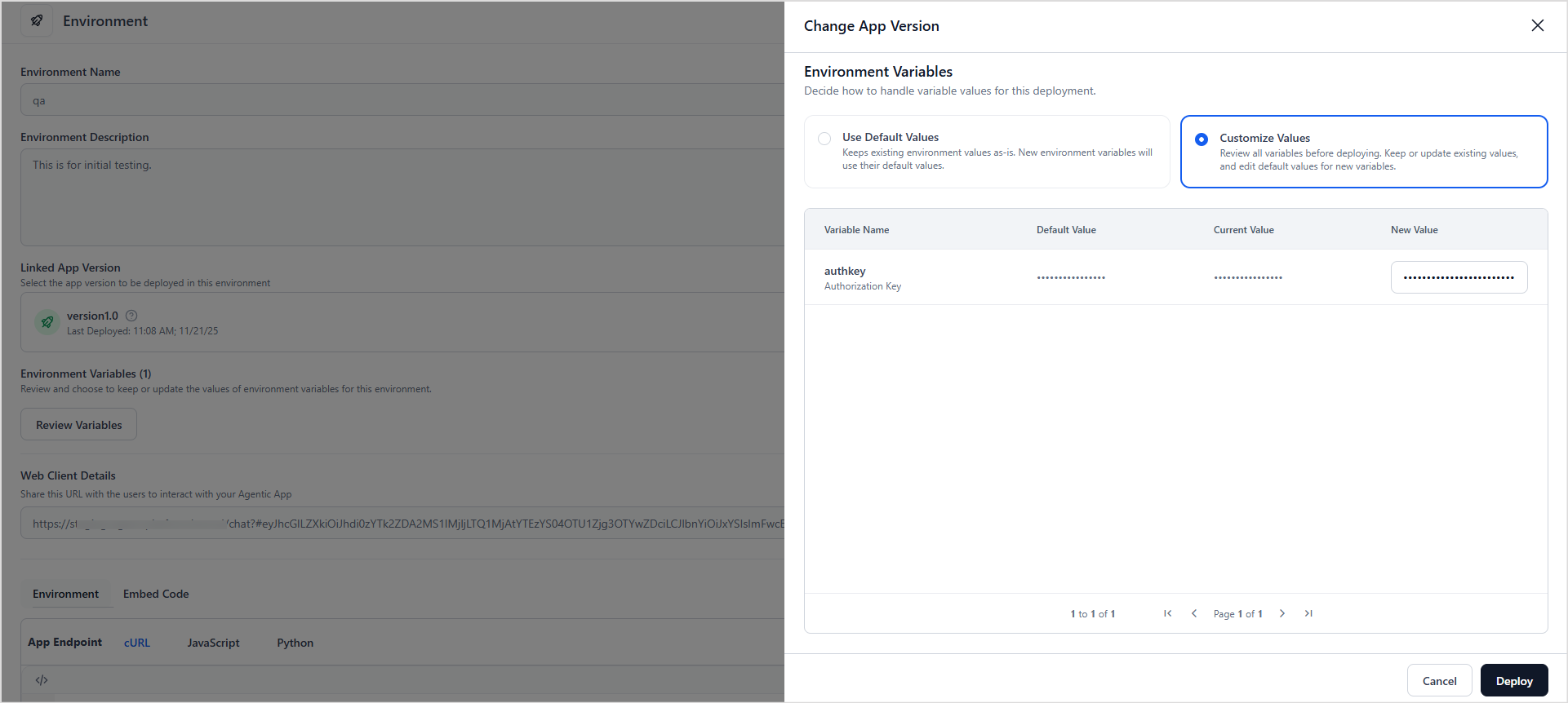 When deploying an updated app version in an existing environment, there are two options for variable values.