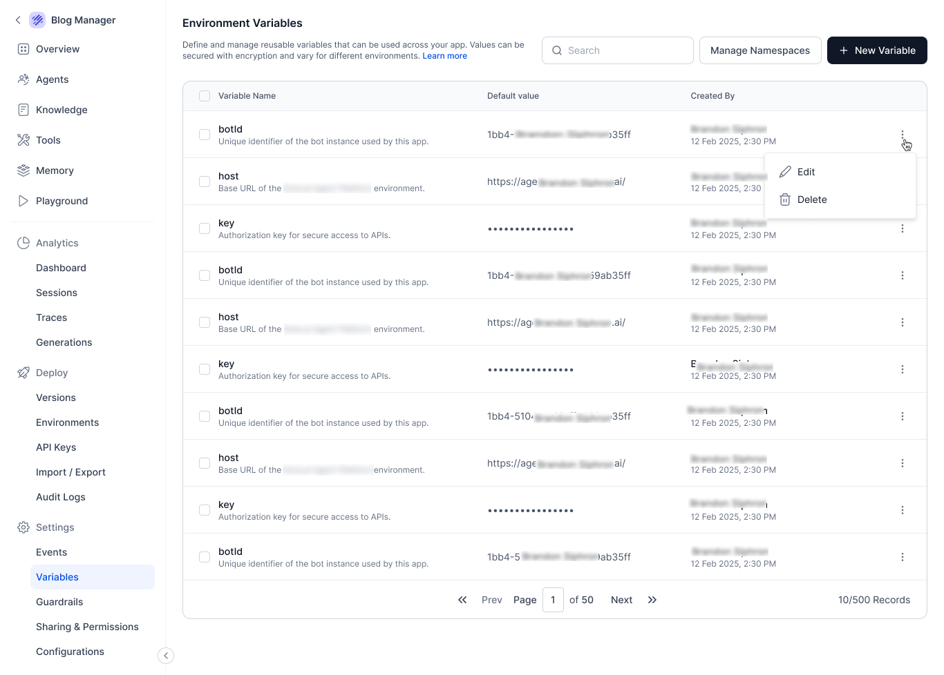 API_KEY,BOT_ID). - Scoped Access: By grouping variables within a namespace, only those relevant to a specific task or code tool are accessible.