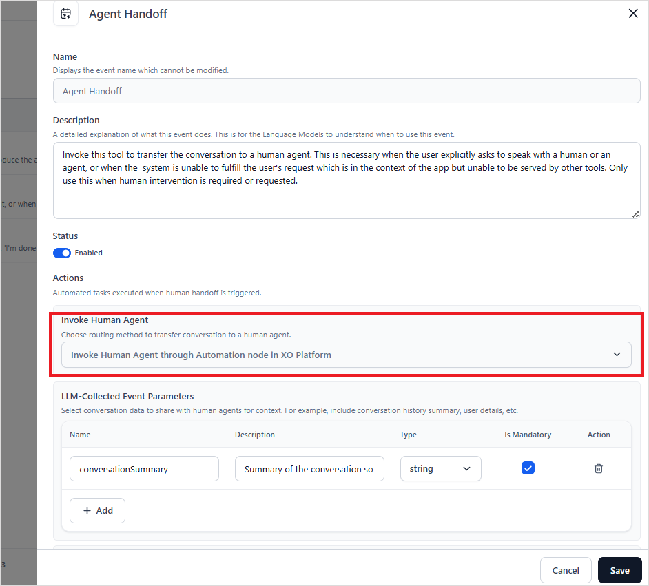 To process these agent transfer requests, set up the Agent Transfer connection configuration for the automation node. When agent handoff event is triggered from the Agent Platform, the request, along with the LLM collected and system defined parameters, is delegated to the automation node. The automation node then routes the request to the appropriate node as defined by its connection rules.