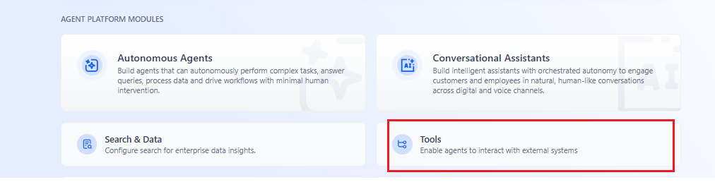 Log in to your Agent Platform account and click Tools under Agent Platform Modules.