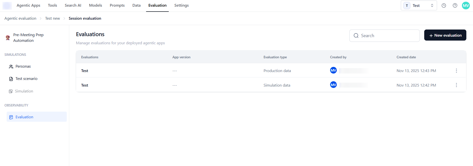 Open your evaluation from Evaluation Studio → Agentic Evaluation → Evaluations.