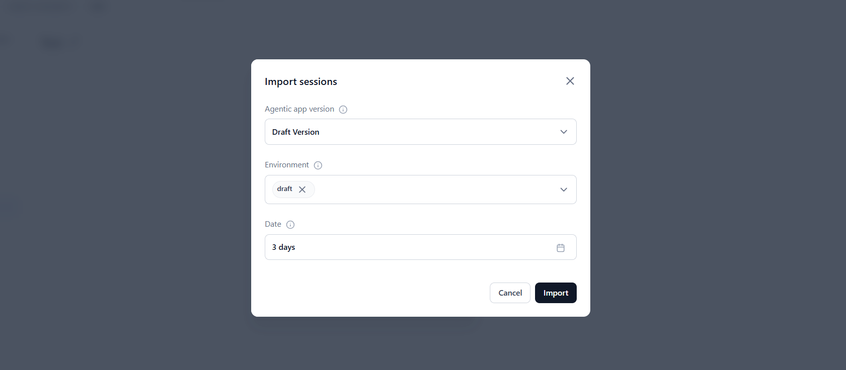 - Environment: Choose the environment that contains the session data you want to import.