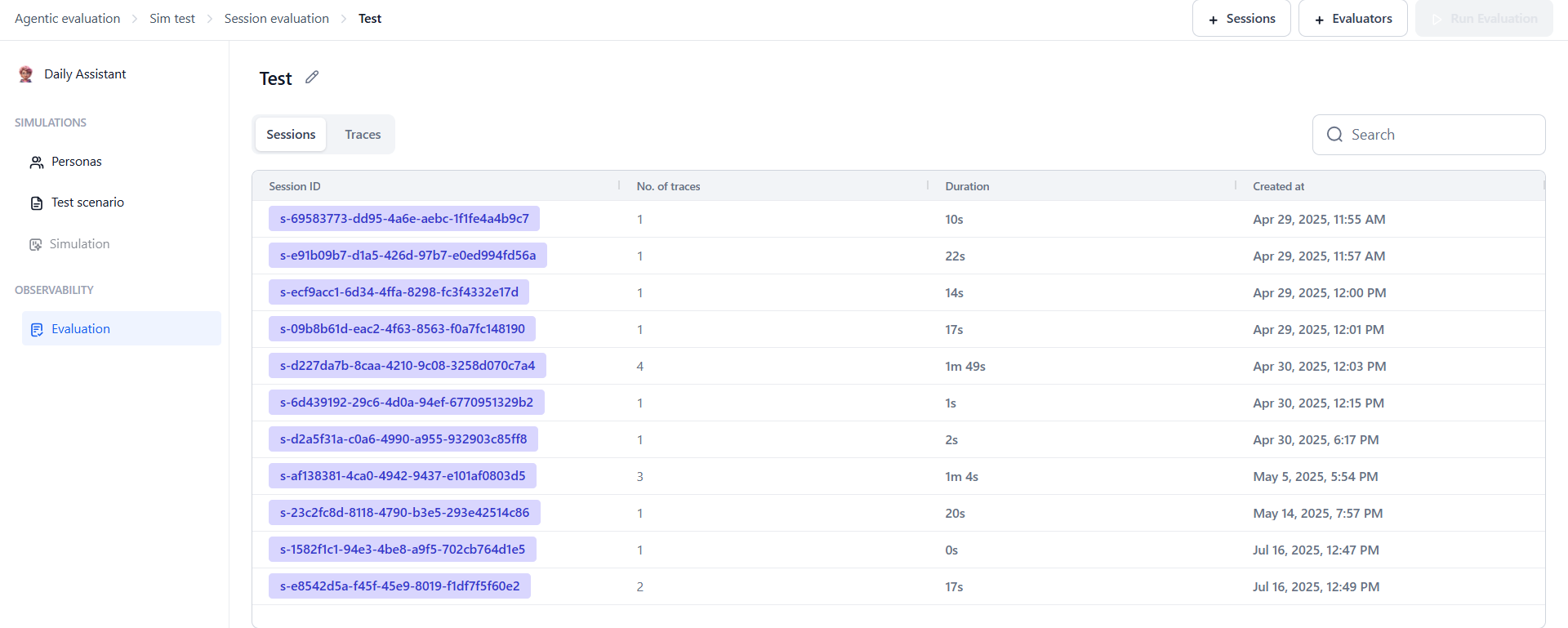 - Sessions: Displays the list of sessions with details like session ID, number of traces, creation time, and duration. Users can add session-level evaluators here to measure overall outcomes. Learn more about Session evaluators.