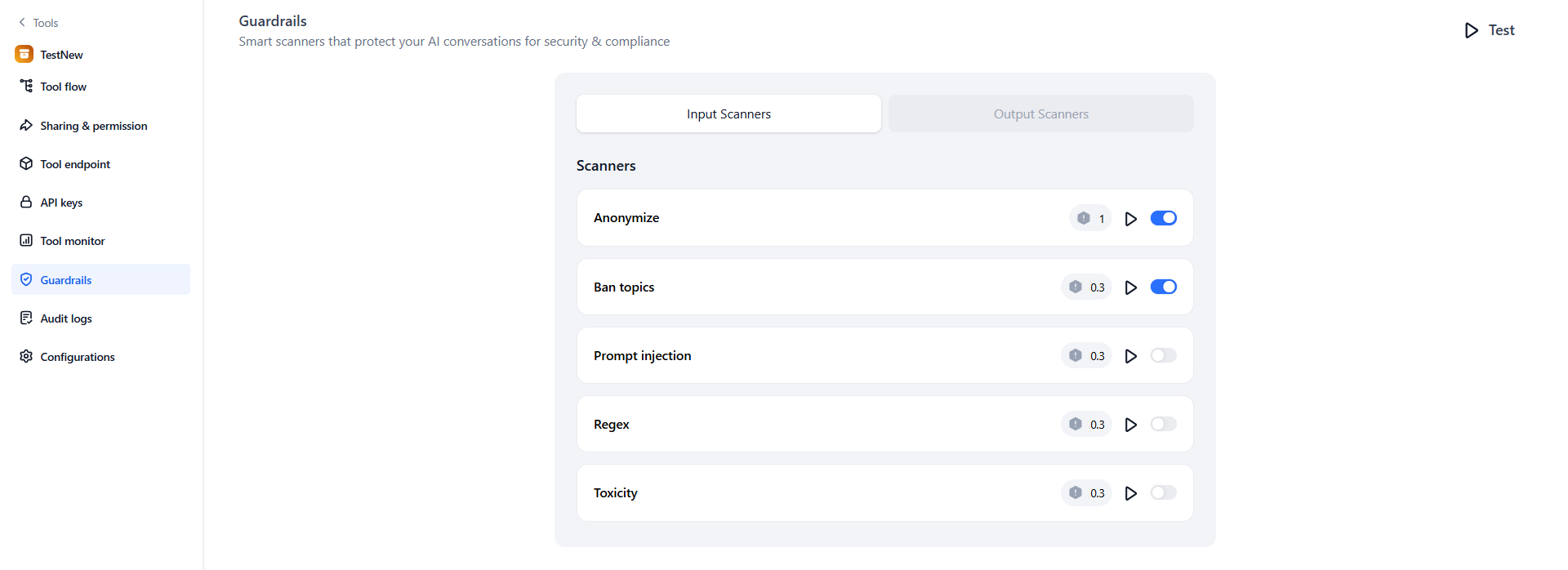 2. On the Guardrails page, review the Input scanners and Output scanners tabs.