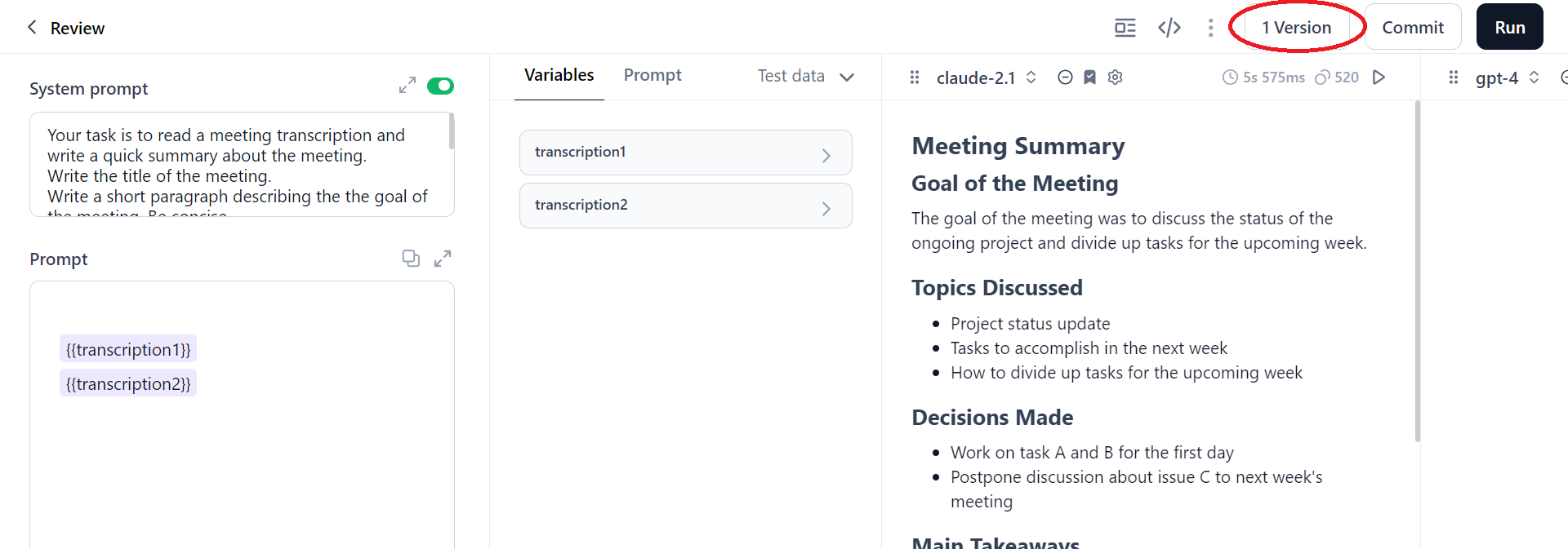To save the current prompt version, click the Commit button on the prompt canvas. The current prompt, system prompt, and the preferred model is recorded as a version.