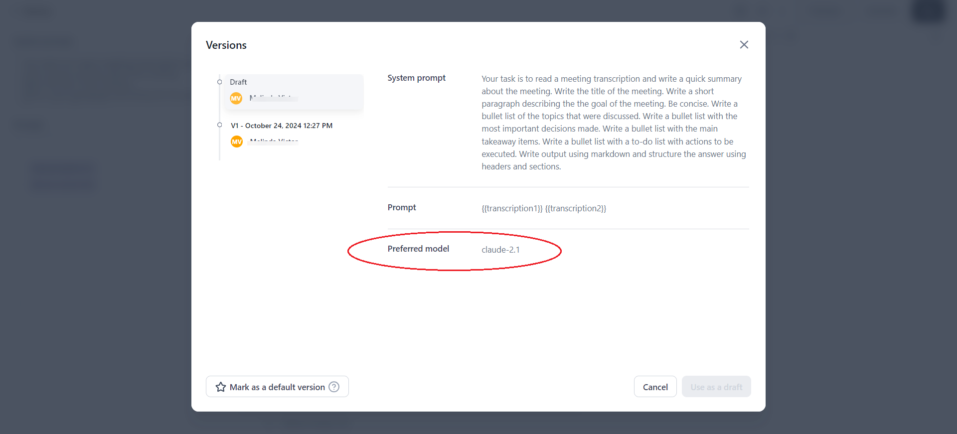 This preferred model will produce the expected output for a given input set (system prompt and human prompt). Choosing a different model may result in varied outputs.