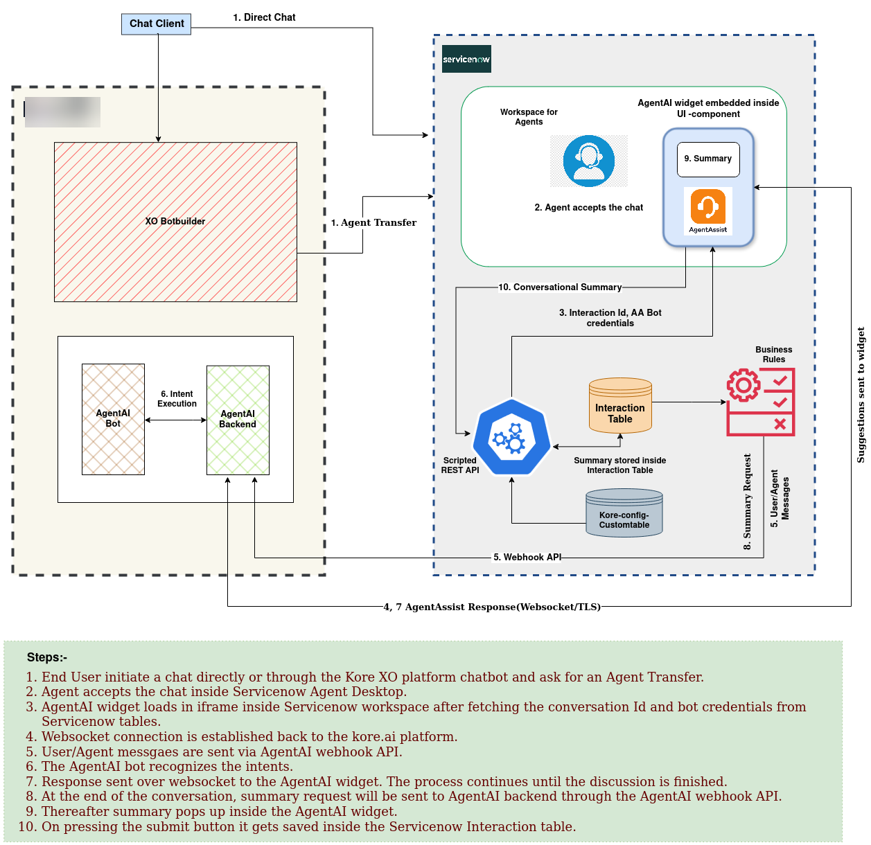 This document provides detailed instructions on integrating the AgentAssist or Agent AI widget with ServiceNow Desktop for the Chat channel. The integration supports all outstanding features of Agent AI, such as Automation, Agent Coaching, Agent Playbook, Sentiment Analysis, and Chat transcription. It will also include an end-of-call summary and Custom Data passing, such as agent name and ID, to the Agent AI widget.