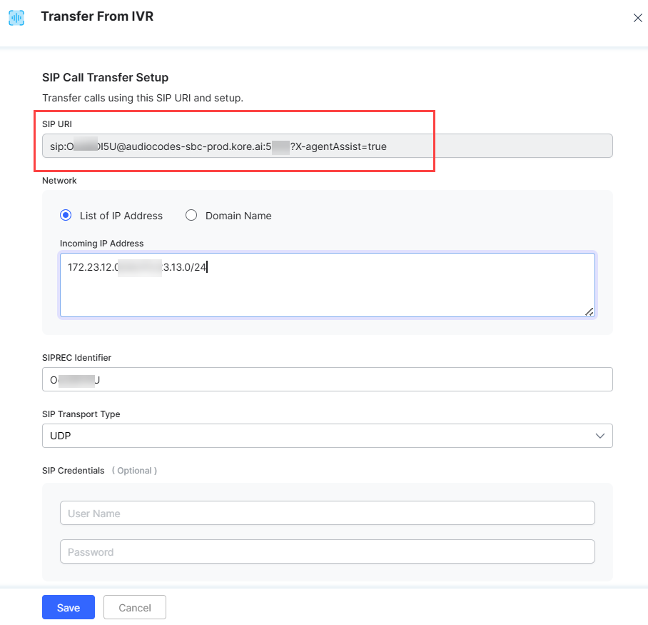 - SipUri: Add “sip:XXXX@savg-us-prod-sbc-in-nlb-0d9a4c651955ff47.elb.us-east-1.amazonaws.com” and replace XXXX with your SIPREC Configuration of Agent AI.