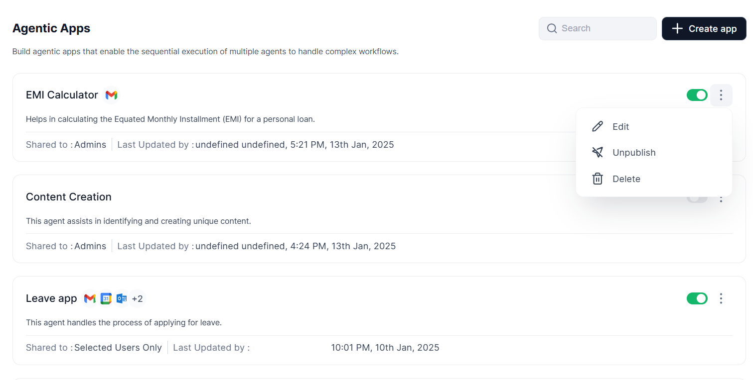 - Publish/Unpublish: Change the agent’s status.