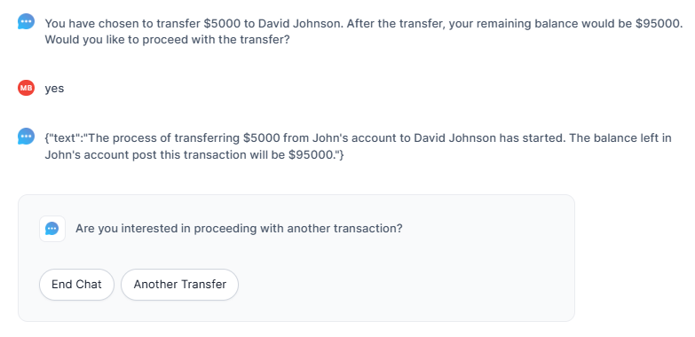 Interacting with the bot agent simplifies communication and task execution. Users initiate a conversation by typing a command. The bot responds promptly, guiding users through the required steps. For example, if performing a task like a fund transfer, users simply need to engage with the bot by providing key details such as the client's name, account information, and transfer amount. Once you complete the task, the bot provides a confirmation or status update.