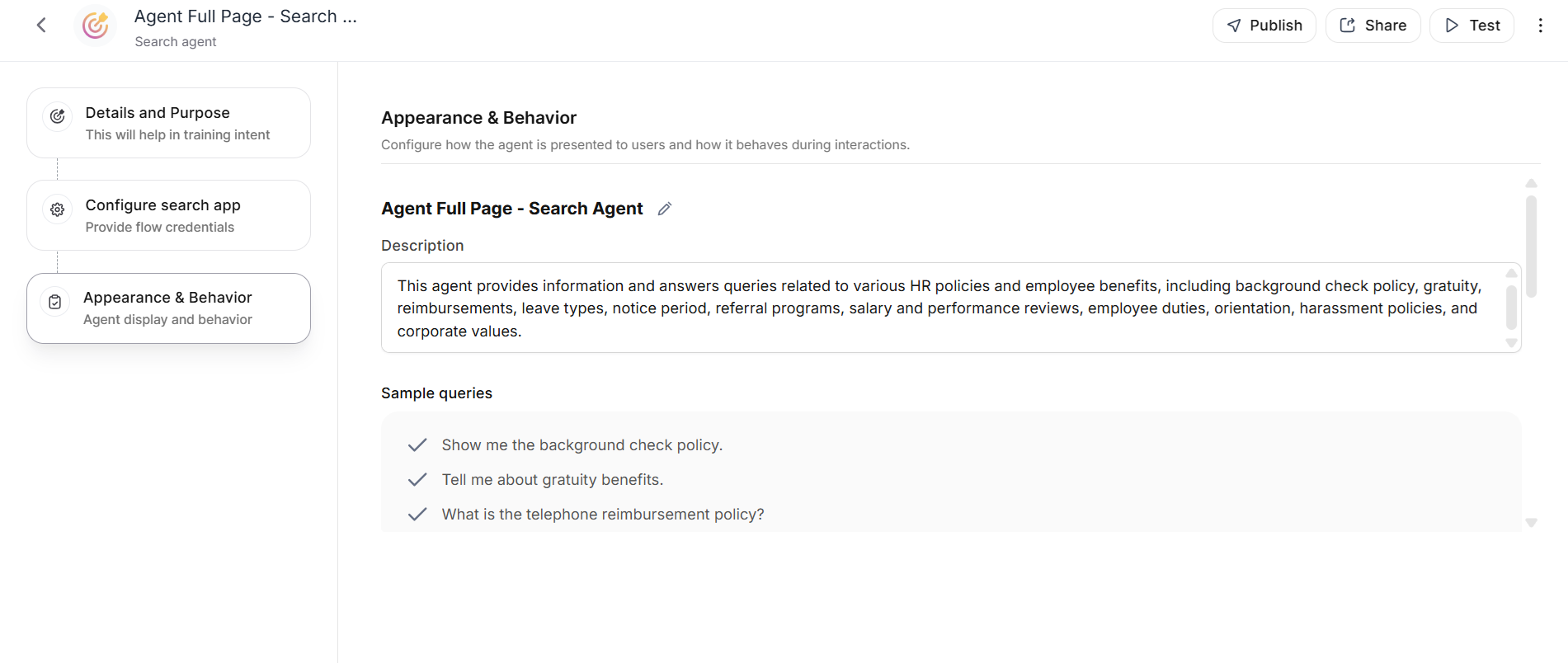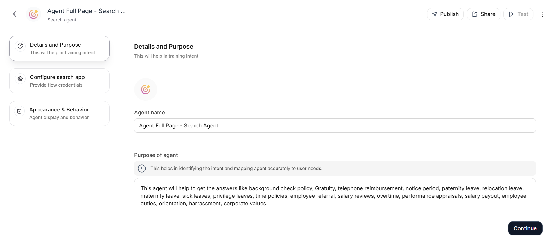 For instance, if an agent is designed to answer all the user queries related to HR policies, specifying it as the purpose helps the system use this agent whenever a user sends a query related to any HR policy.