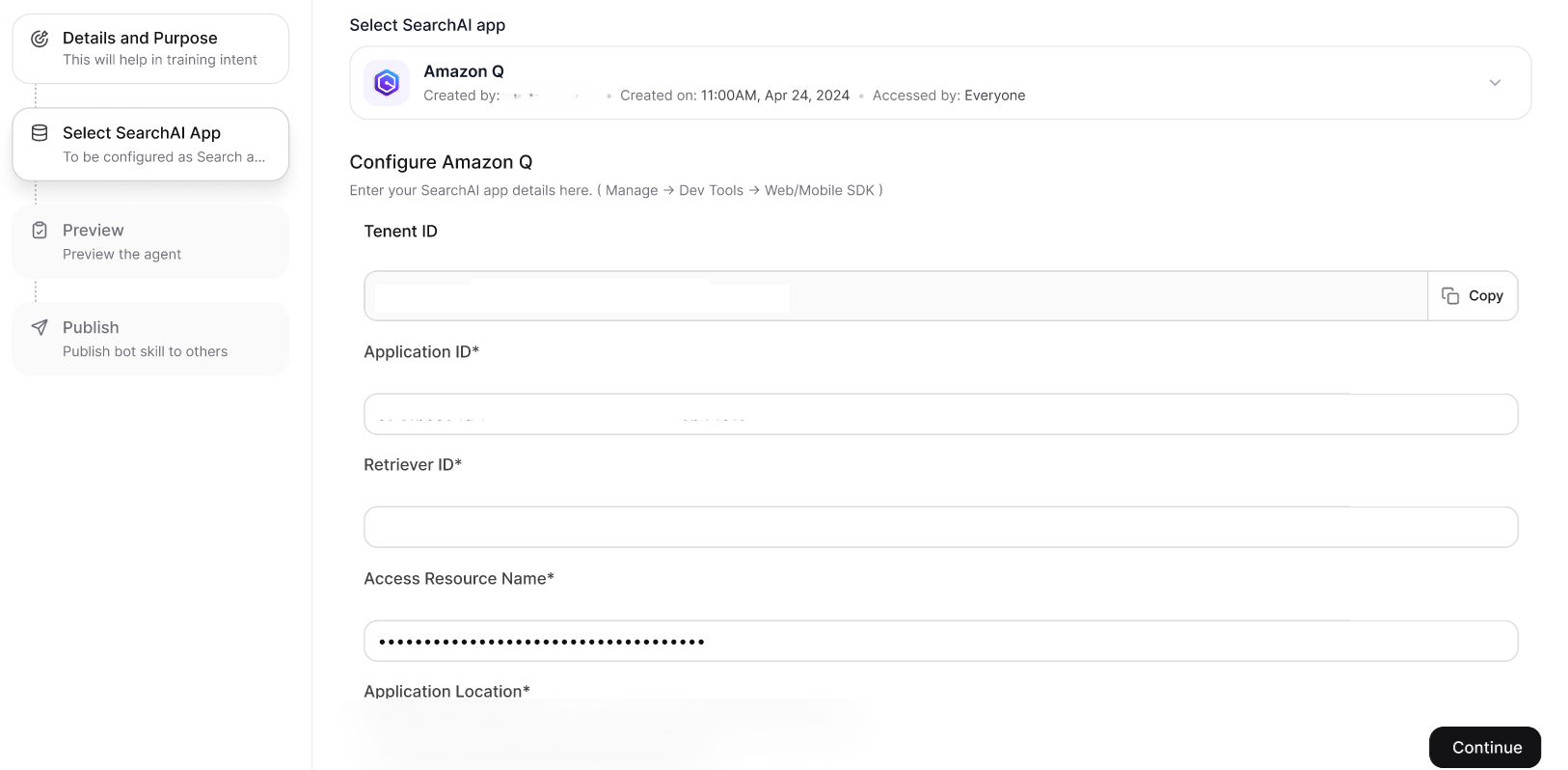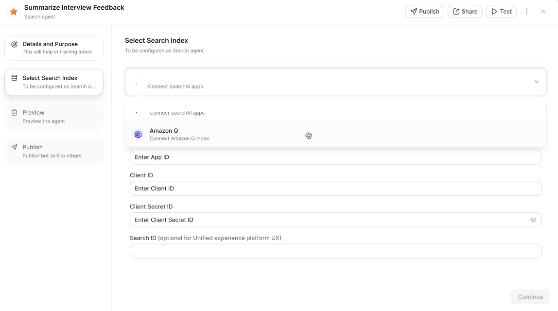 - Provide the configuration details of the Search AI application or Amazon Q index to set up the interaction between the RAG Agent and your chosen search solution.