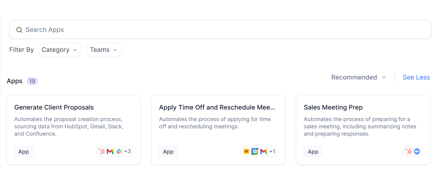 A team leader might install an Agentic App that combines multiple agents to handle a multi-step process, such as lead generation, qualification, and follow-up.