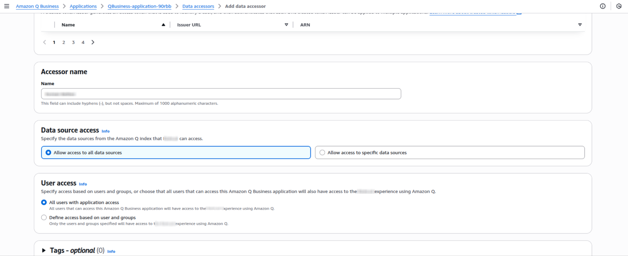 - In the Q Business Application console, navigate to Data Accessors.