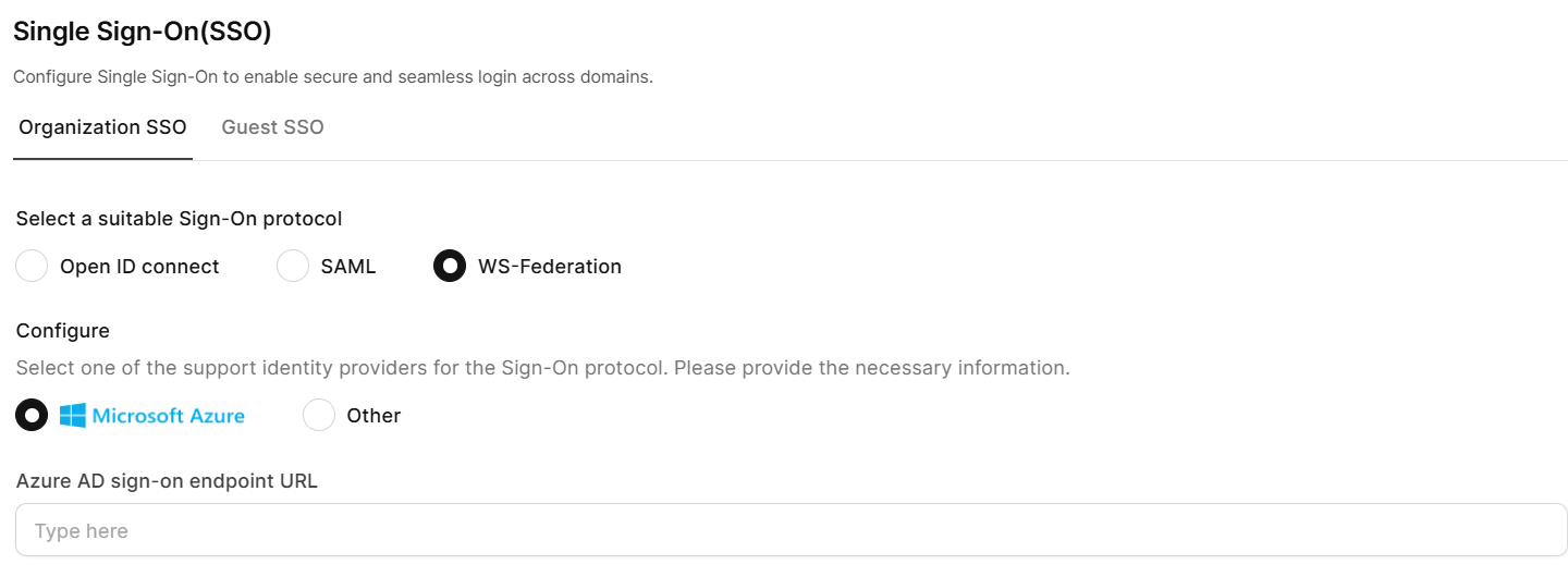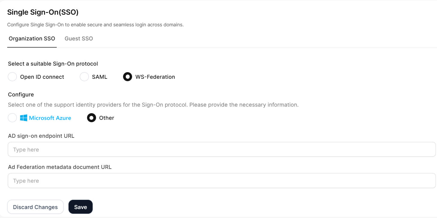 Use this option for any WS-Federation compliant identity provider not specifically listed above, including on-premises Active Directory Federation Services (ADFS) deployments. This flexible configuration supports custom enterprise identity solutions and third-party WS-Federation providers.