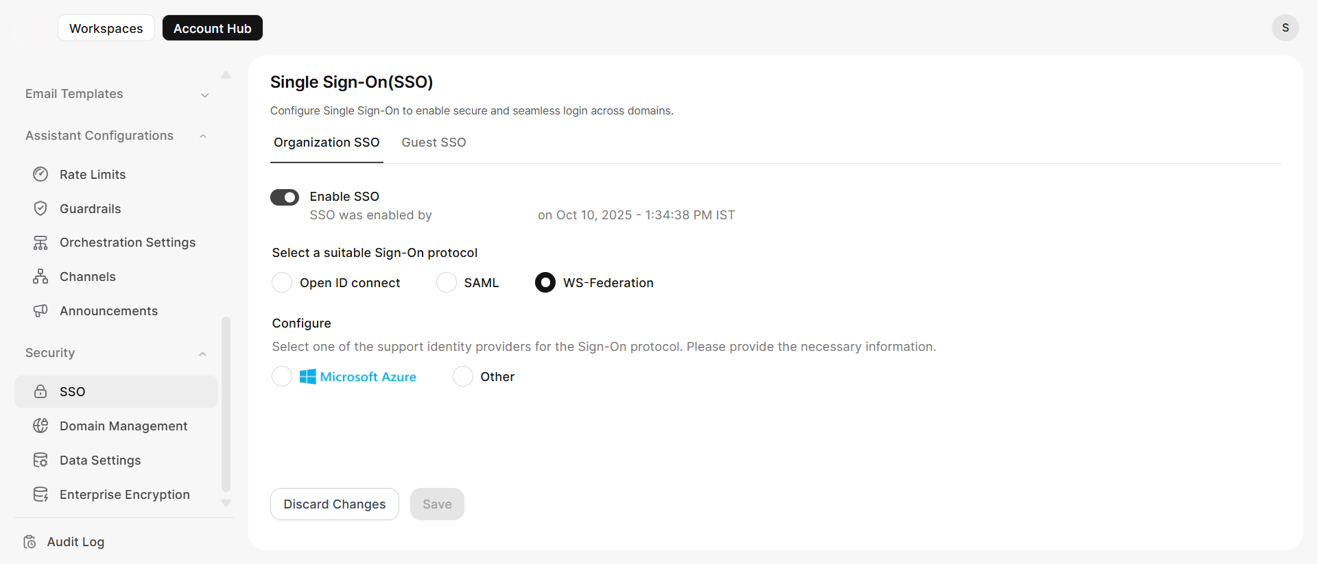 - Turn on the toggle Enable SSO.