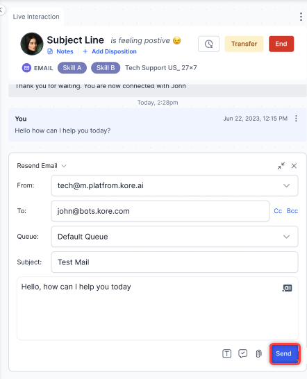 If the Auto Answer mode is enabled in Agent Settings, the Transfer/End buttons do not display on the Live Interaction pane until the assigned agent sends the first message.