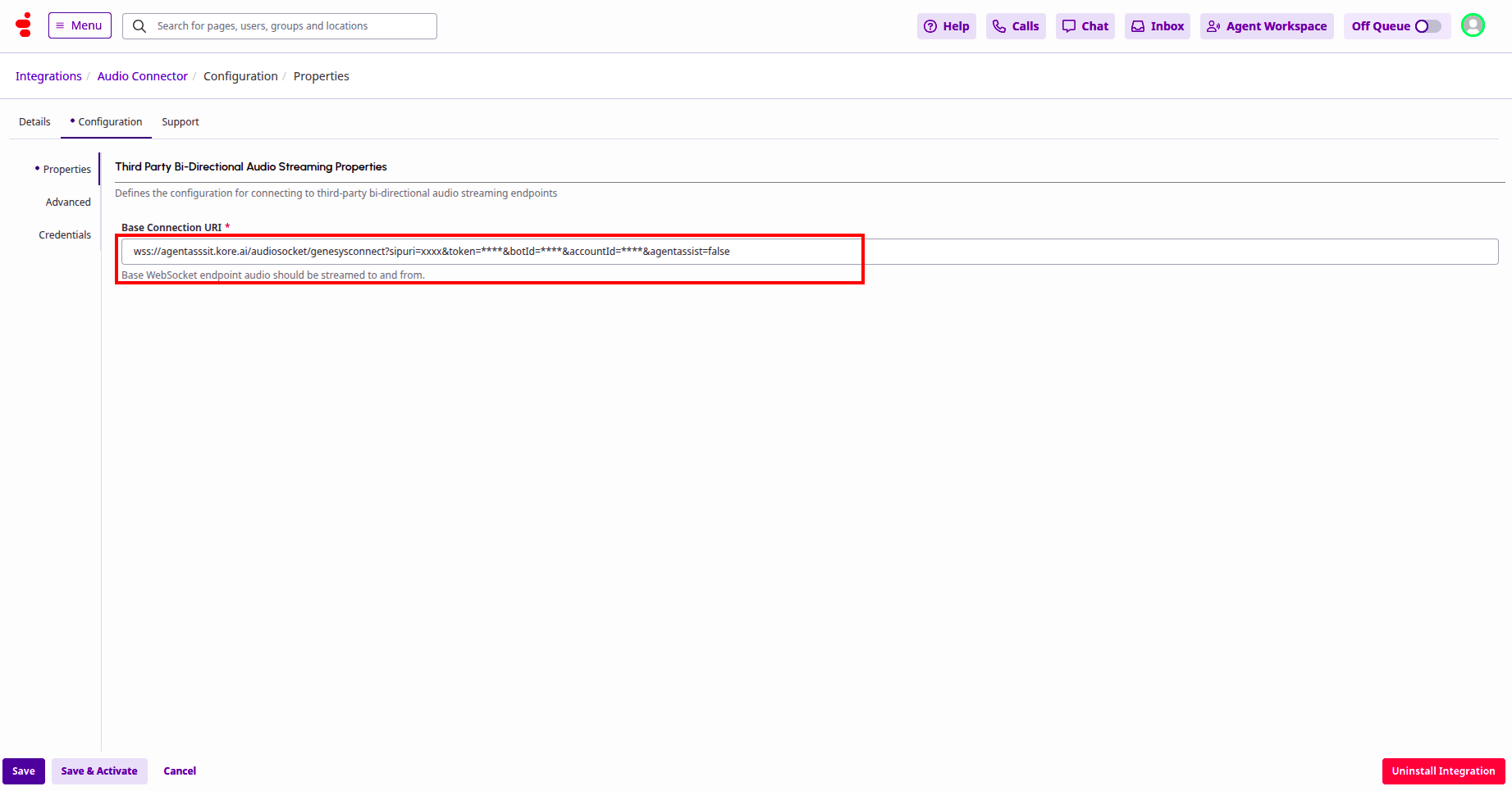 - The Base Connection URI format should be similar to “wss://{Kore Voice Gateway(KVG)}/audiosocket/genesysconnect/?sipuri=xxx&token=xxx&botId=xxx&accountId=xxx&agentassist=false”.