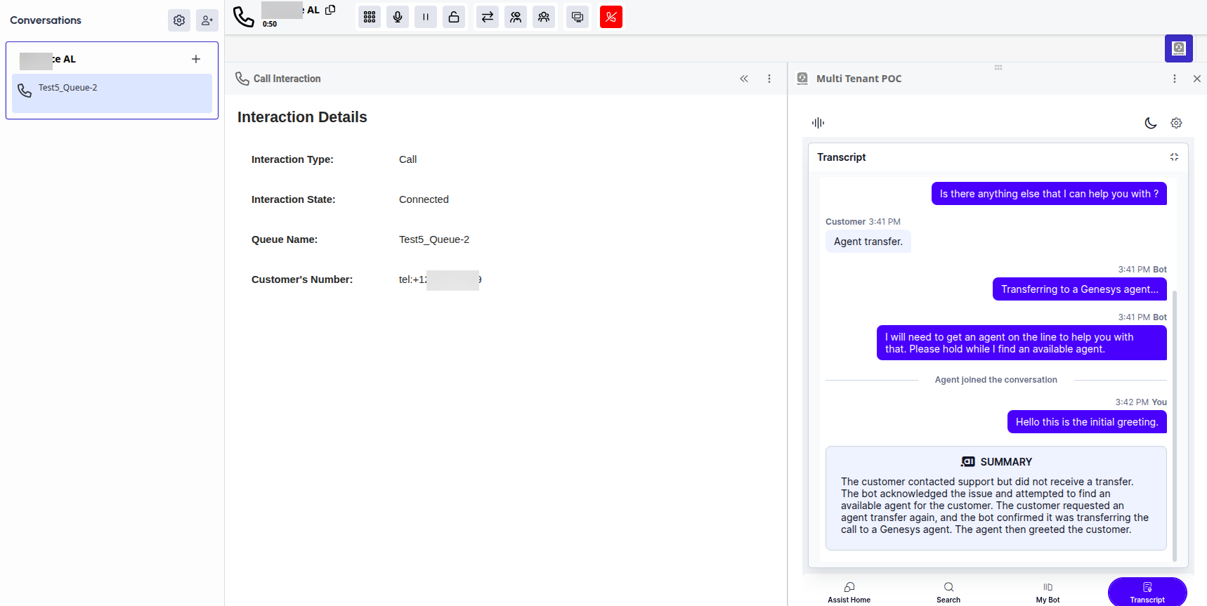Call the phone number you purchased in the previous steps. After automation and a successful agent transfer from SmartAssist to Genesys, the signed-in Genesys agent can accept the incoming calls.