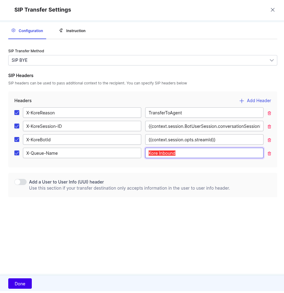 Parameter Value SIP Transfer Method SIP BYE Headers X-KoreSession-ID TransferToAgent X-KoreSession-ID {{context.session.BotUserSession.conversationSessionId}} X-KoreBotId {{context.session.opts.streamId}} X-Queue-Name Kore Inbound (queue created in Genesys) - Click Done.