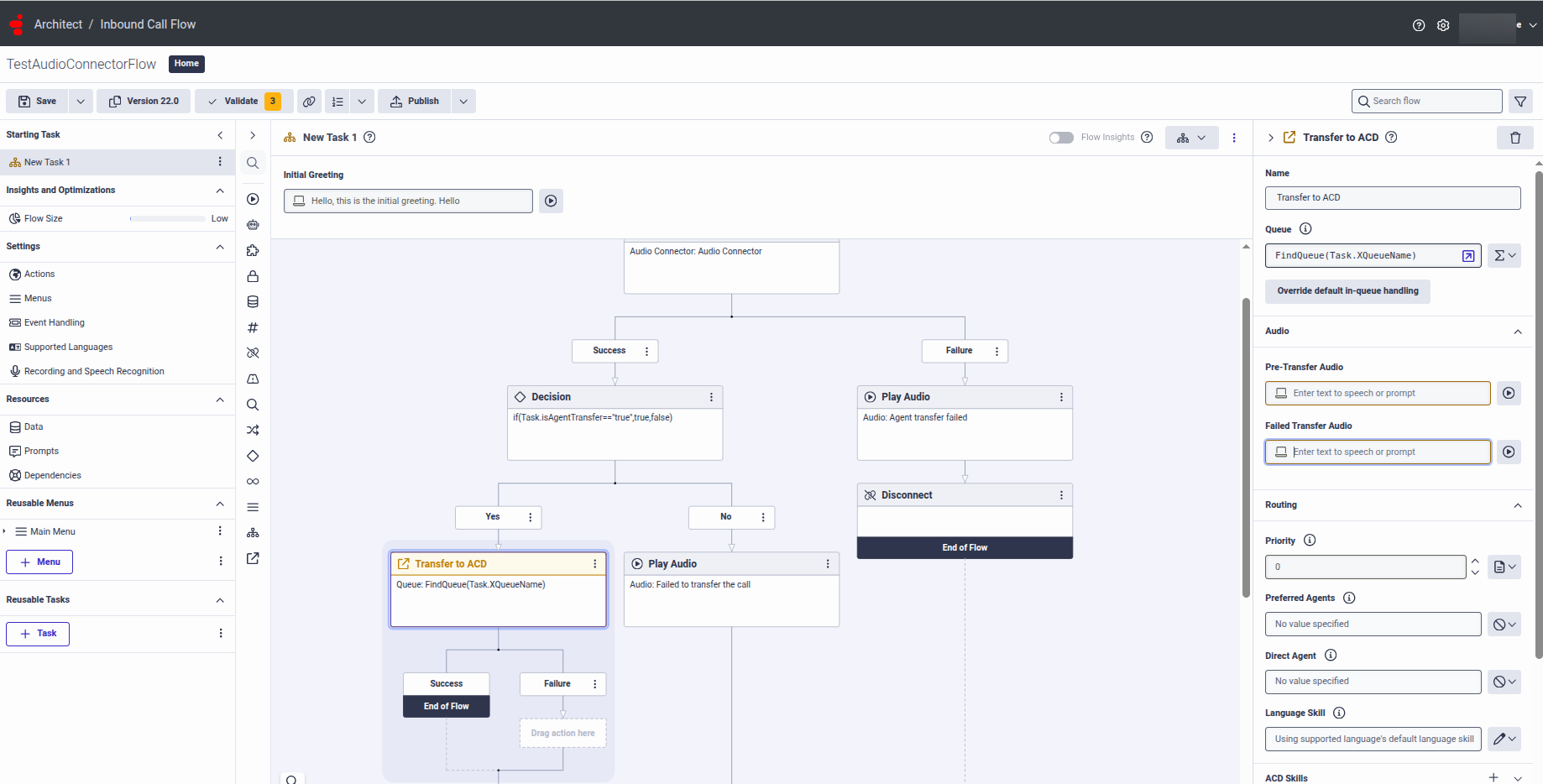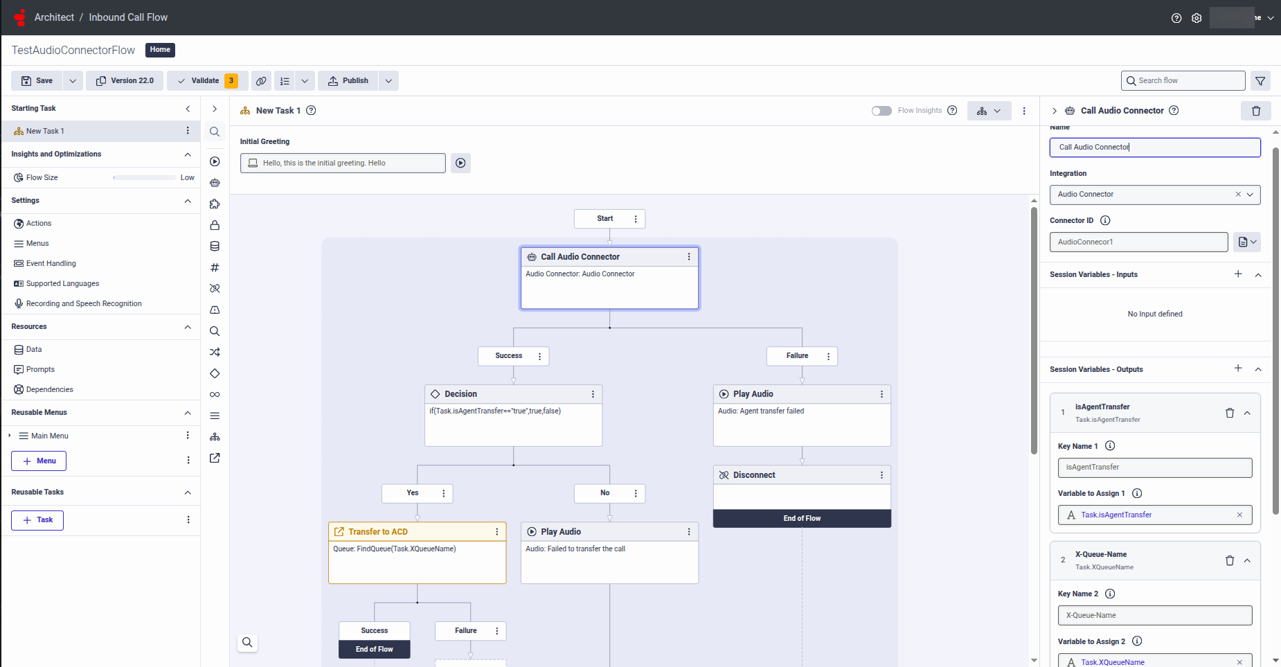 - After the Start node, add a Call Audio Connector node in the architect flow.