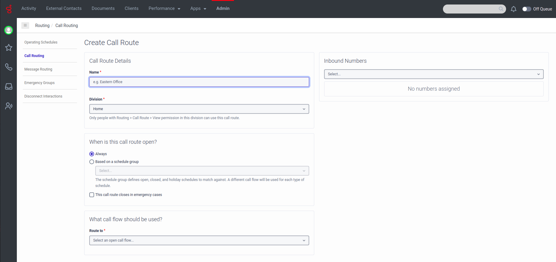 - Go to Admin > Call Routing.