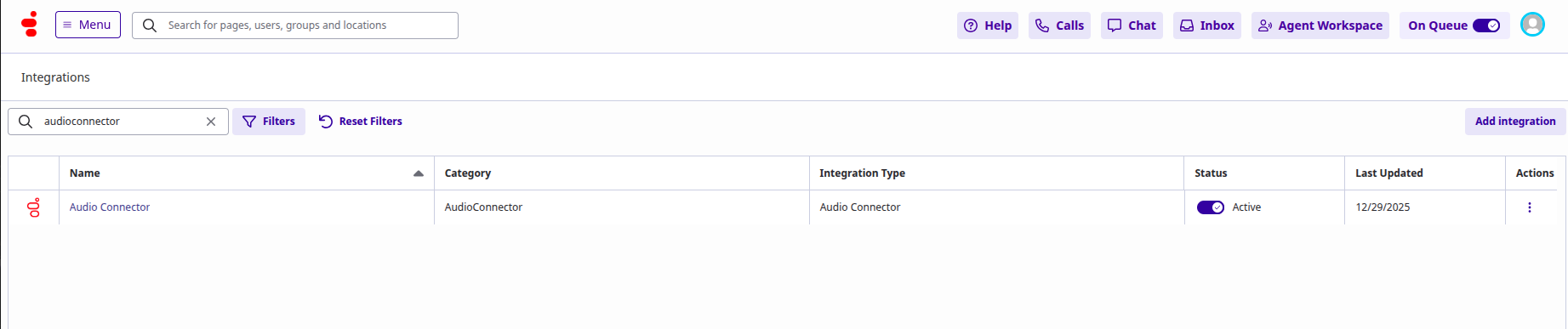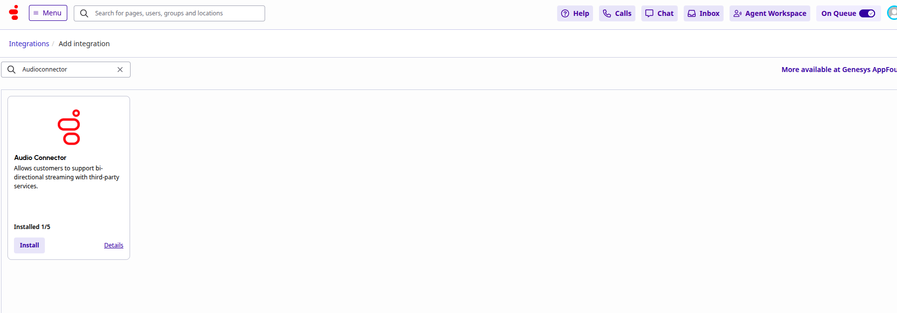 Audio Connector integration requires specific configuration values to support Agent AI configuration. - Install a new audio connector app by clicking the Add Integration button in the top-right corner.