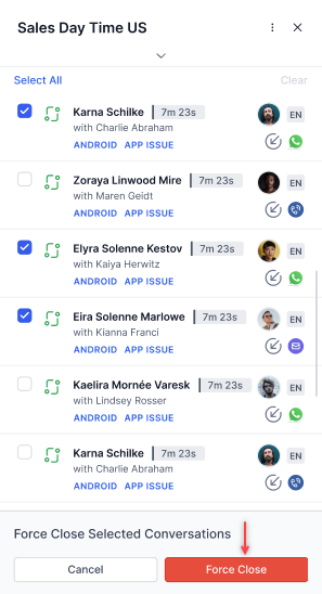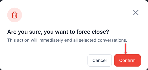 - A confirmation pop-up is displayed. Click Confirm. The selected conversations are closed across their respective channels.