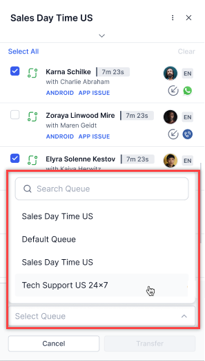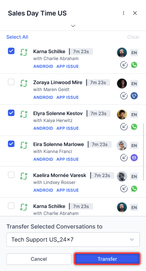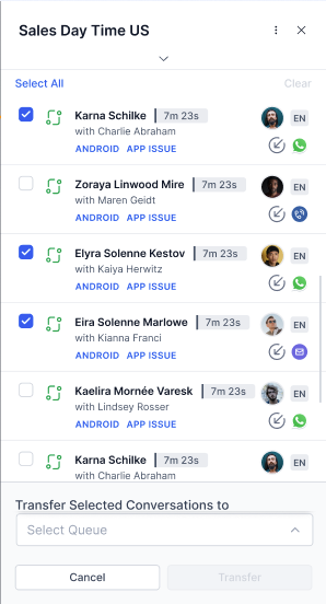 - Click Transfer. The selected conversations are reassigned to the chosen queue.