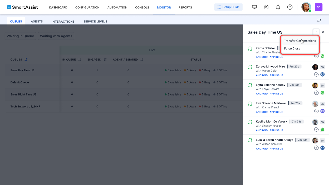 Managers can monitor live conversations between agents and customers. The supervisor can view the agent engagement metrics. At any point, the supervisor can view details of the agent-customer conversation, or the supervisor can manually assign the agent to another available agent. It applies to both inbound and outbound conversations.