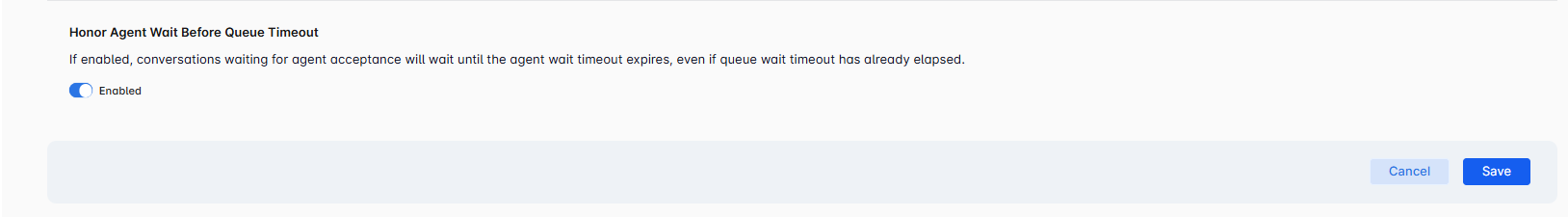 Hold interaction in queue until the wait time expires: When enabled, interactions remain in the queue till the set queue max timeout, regardless of agent availability.
