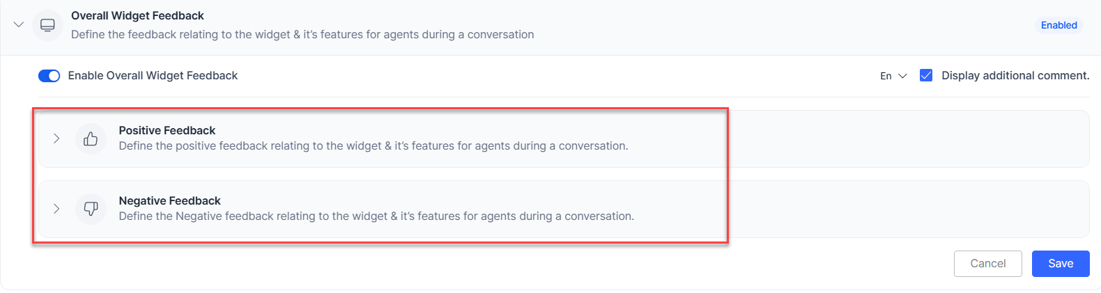 - Overall Widget Feedback: Configure up to six positive and six negative feedback messages, but enable only five from each category at a time. To enable a sixth, you must first disable another. You can also choose to display or hide an additional comment box and select a display language. By default, this feature remains in disabled status.