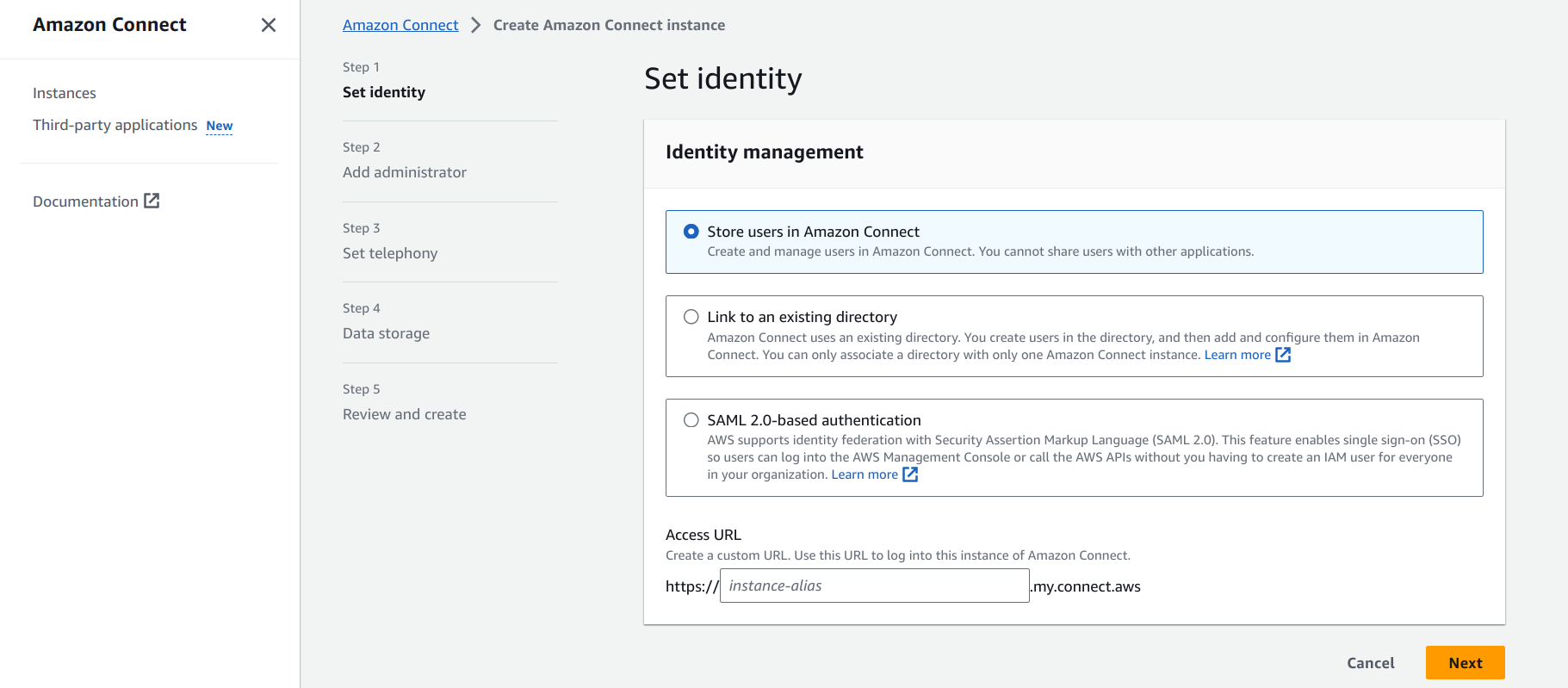 Select an option in the Identity management section, and enter the Amazon Connect instance name in the Access URL field.