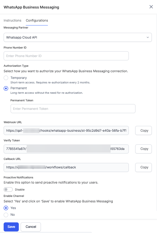 • Select Yes to enable the WhatsApp Business Messaging channel.