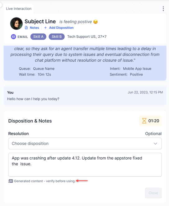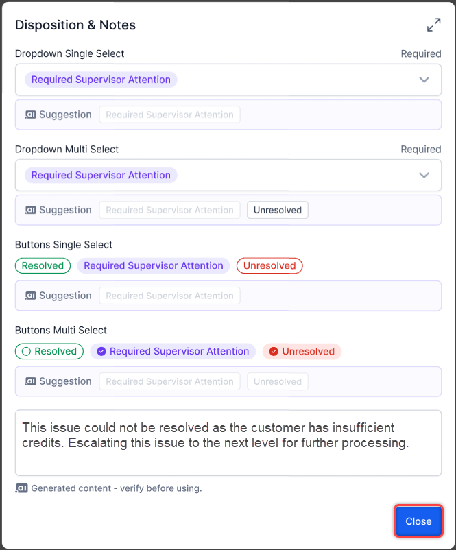 Agents can select a disposition code to accept it, or choose multiple disposition codes if needed, and then click Close.