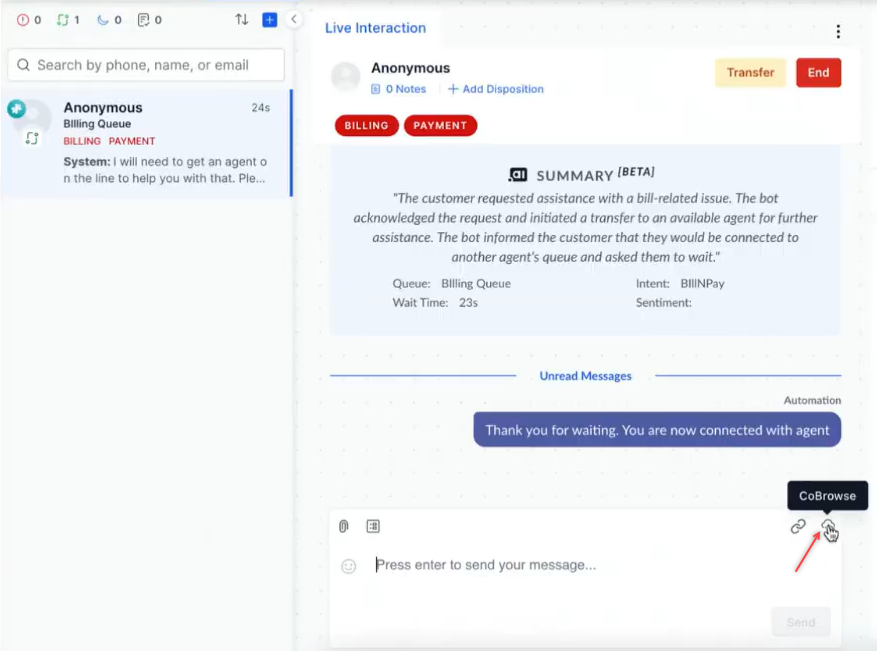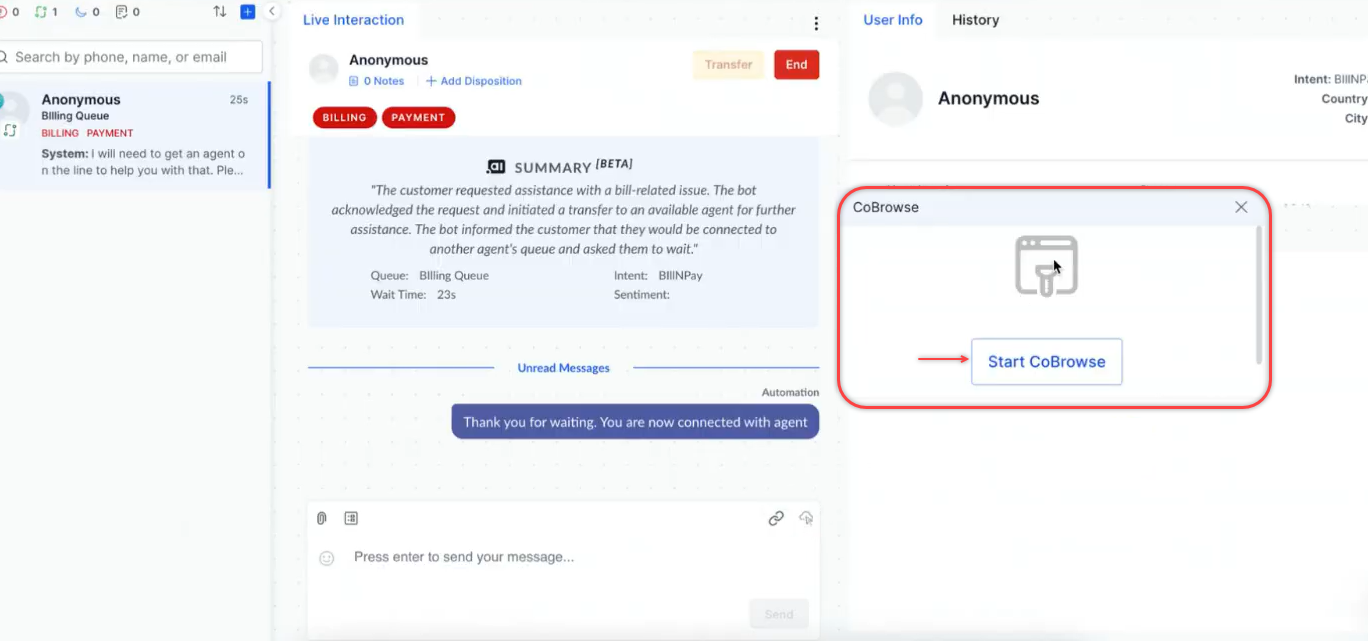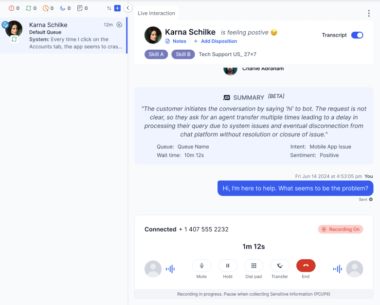 Agents receive the Click-to-Call interaction in the Live Interaction pane, similar to an inbound voice call. The system displays the metadata and prior chat transcript to the agent. During the call, agents can pause and resume recording when handling sensitive information. After the call ends, the system stores the transcription and disposition summary. Learn more.