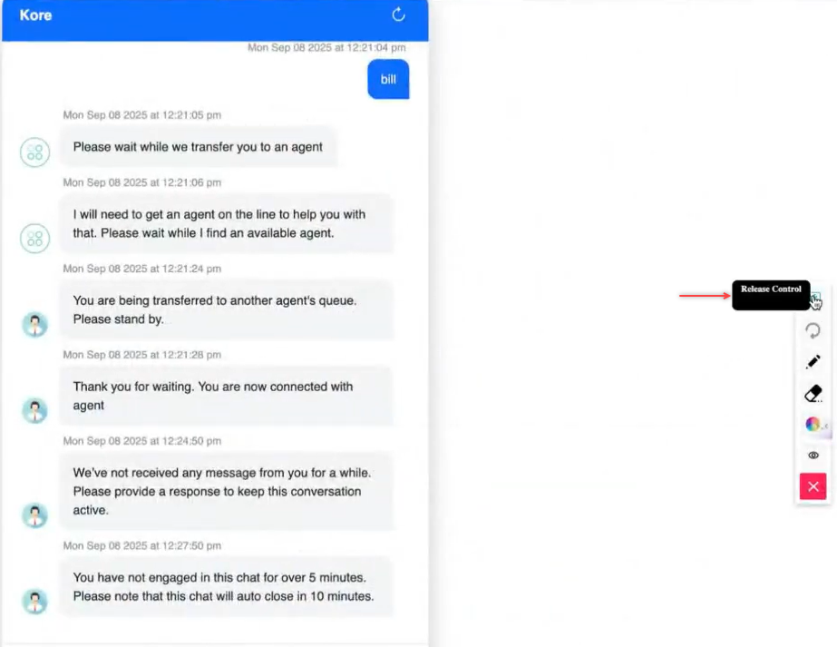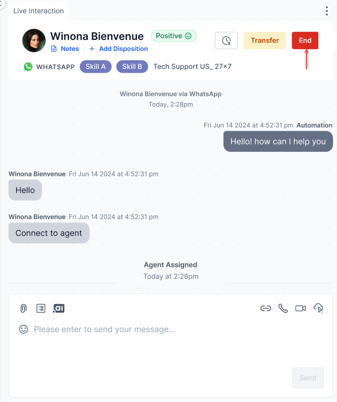 If the Auto Answer mode is enabled in Agent Settings, the Transfer/End buttons do not display on the Live Interaction pane until the assigned agent sends the first message.
