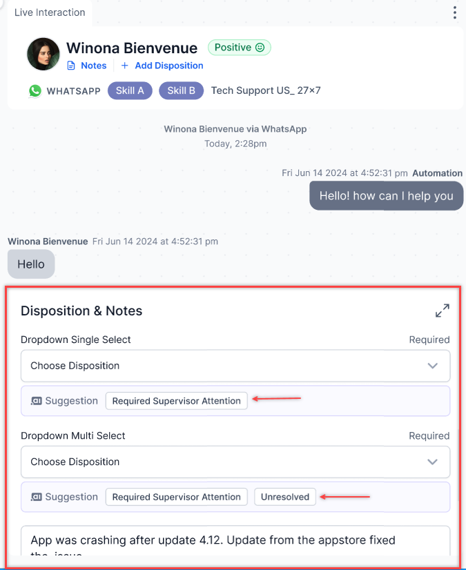 When enabled, agents receive intelligent disposition code suggestions automatically at the end of customer conversations. The feature uses LLM analysis of the full conversation transcript and disposition set metadata to recommend the most appropriate wrap-up code. Suggestions appear prominently in the disposition bar and can be accepted with one click or overridden manually, ensuring higher accuracy and reduced wrap-up time. Learn more.