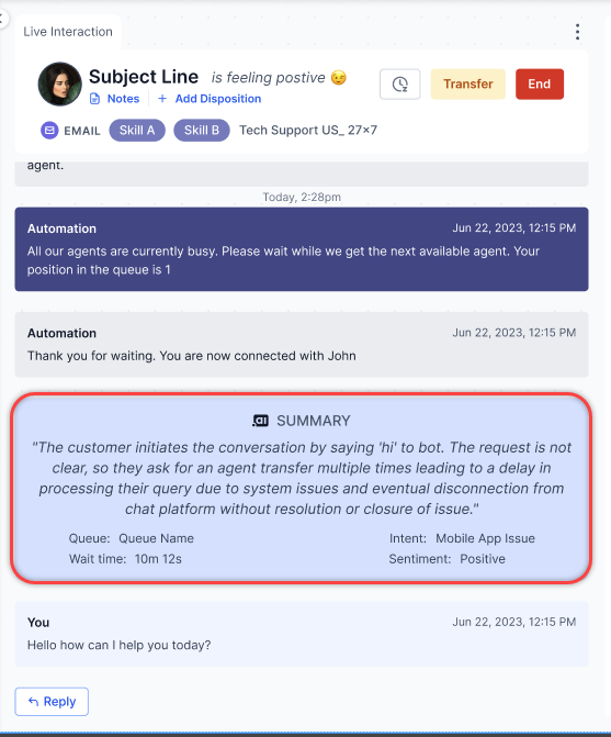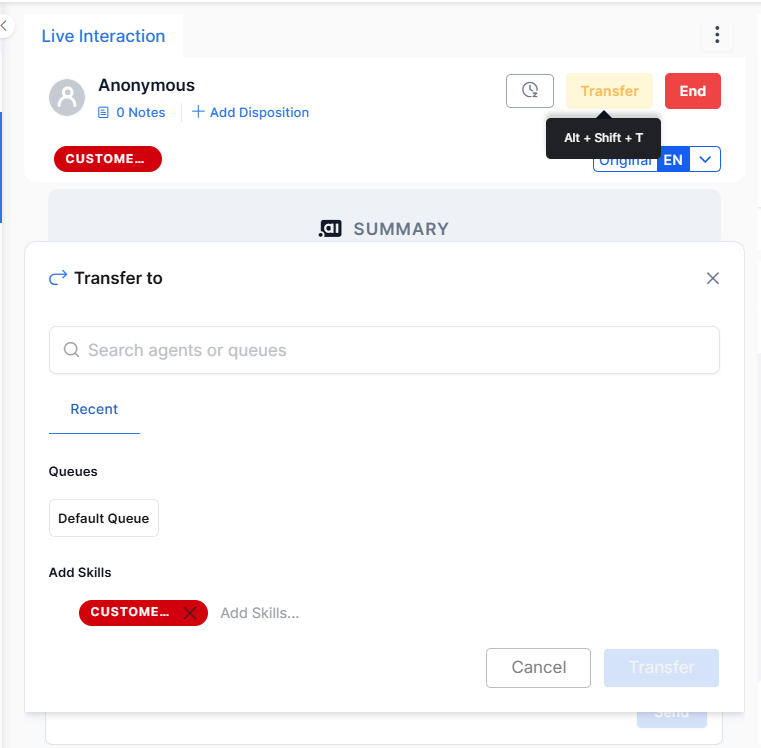 - SUMMARY: Conversation Summary leading up to the transfer. In case of multiple transfers, the summary of all transfers is shown.