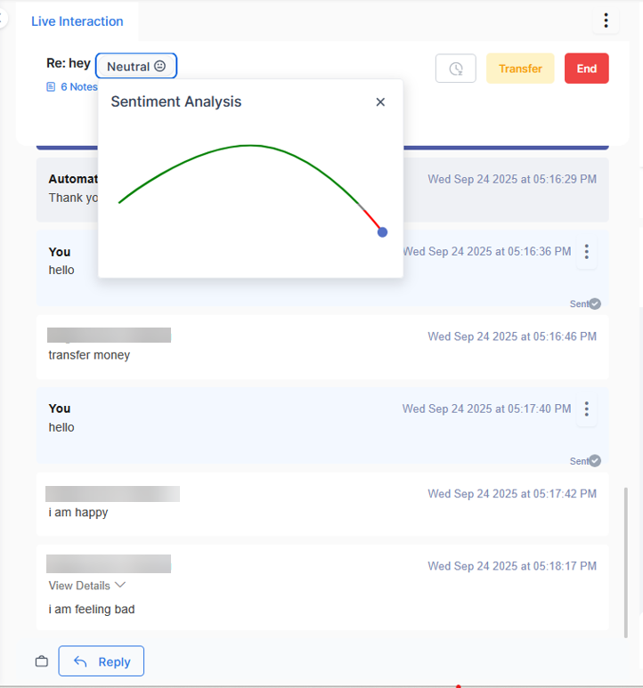When agents click the sentiment indicator, a graph appears, visually representing emotional fluctuations throughout the interaction. Agents gain immediate insight into customer emotions. This insight helps them adjust their tone, approach, and responses promptly, leading to improved empathy and more effective issue resolution. Agents can also customize the graph to focus on specific timeframes or sentiment ranges, allowing deeper analysis when needed.