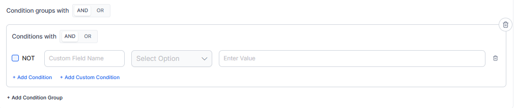 + Add Custom Conditionto create your own rule. Campaign managers can configure the custom values (in JSON format) as:Custom Field Name(Key Name), operator from the defined operators list, and value