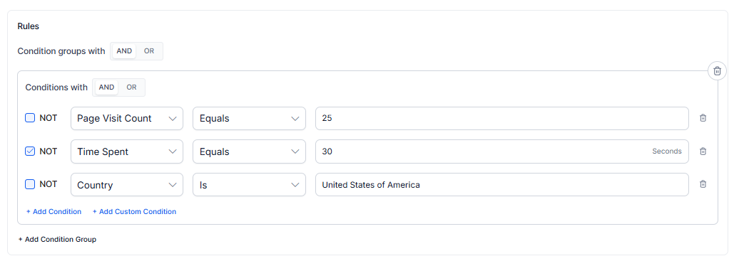 Field Data Type Supported Operators Page Visit CountNumber Equals, Greater Than or Equal To Time SpentNumber Equals UserString Is (known / anonymous) CountryString Is StateString Is CityString Is DeviceString Is (Mobile / Laptop / Tablet) URLString Contains, Ends With Page NameString Is, Contains Hover OnString ID, Class, and Query Selector You can apply the NOT operator at any condition level to invert the condition.