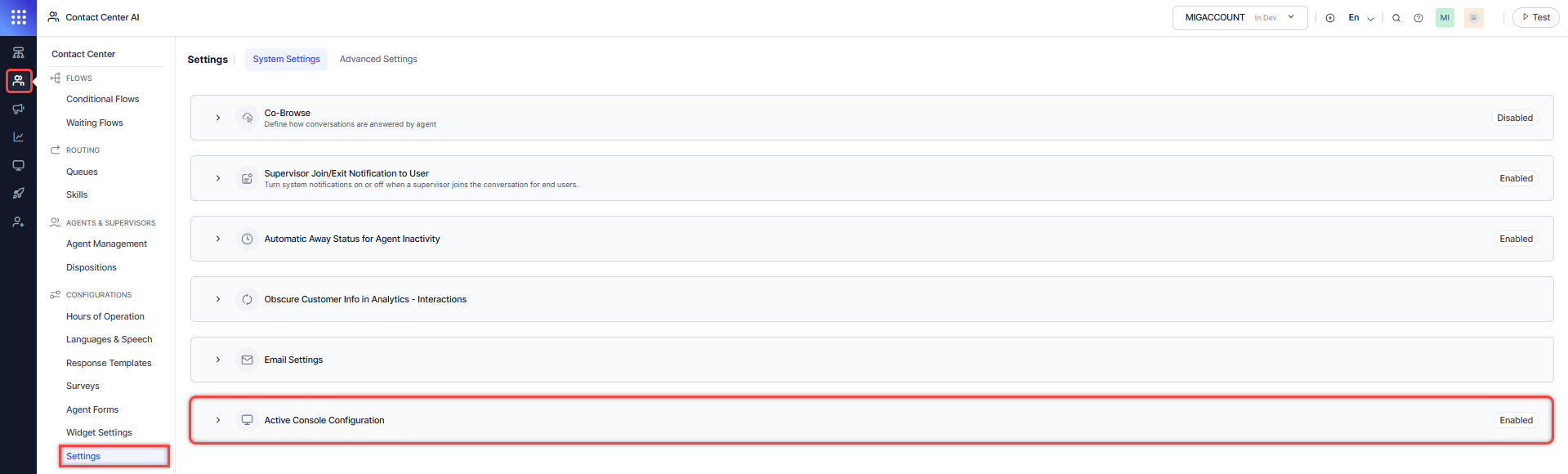Active Console Configuration ensures seamless management of agent sessions when the console is open in multiple tabs, devices, or browsers. It prompts agents to transfer the active session to the new tab or device and blocks concurrent use until they confirm the transfer. The feature maintains session continuity, establishes new connections as needed, and logs all transfer actions in audit reports.