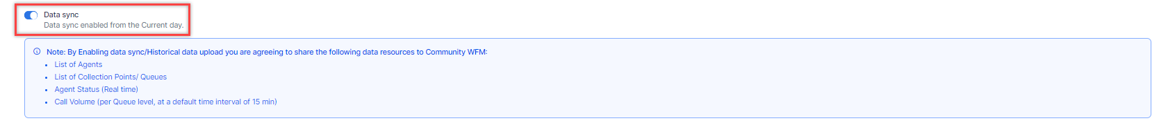 Community WFM includes Machine Learning models that analyze data and forecast future call volumes. To use this feature, you can enable data sharing from Contact Center AI to Community WFM by turning on the Data sync toggle. (Optional)