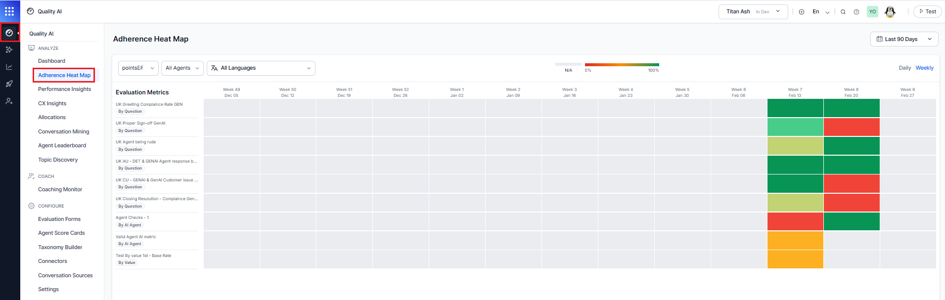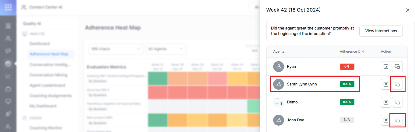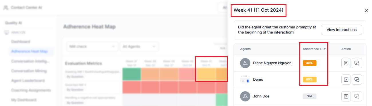 Navigate to Quality AI > ANALYZE > Adherence Heatmap.