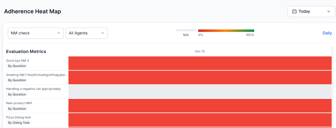 Supervisors Agents can use flagged fatal errors to self-assess and prepare for coaching. Visual adherence scores (heat maps) and question-level feedback support this process. For more information, refer to AI-Assisted Manual Audit.