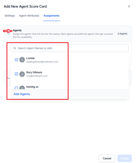 In the Agents, assign scorecards across the required agent by searching an Agents name and click Add Agents to add agent names.