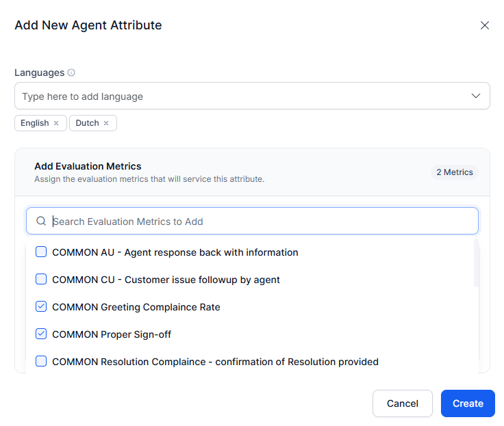 This feature enables the creation of agent attributes by combining existing evaluation metrics. This calculates the Agent Attribute Score using data from evaluation metric results. Agent attributes are specific areas of performance relevant to an agent's role like Professionalism, Product Knowledge, Problem-solving skills, and Customer service skills.
