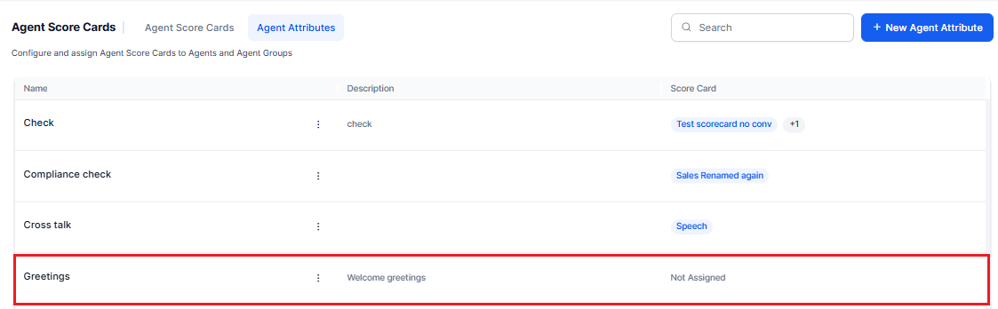 Agent Scorecards facilitate the development of evaluation criteria at the individual agent level, focusing on configured performance areas such as salesmanship, product knowledge, and so on. Attributes are defined by integrating relevant evaluation metrics. Additionally, each agent is assessed based on all assigned scorecards during each call transfer, allowing for multiple scorecards per agent. Prior to creating scorecards, it is essential to create agent attributes.