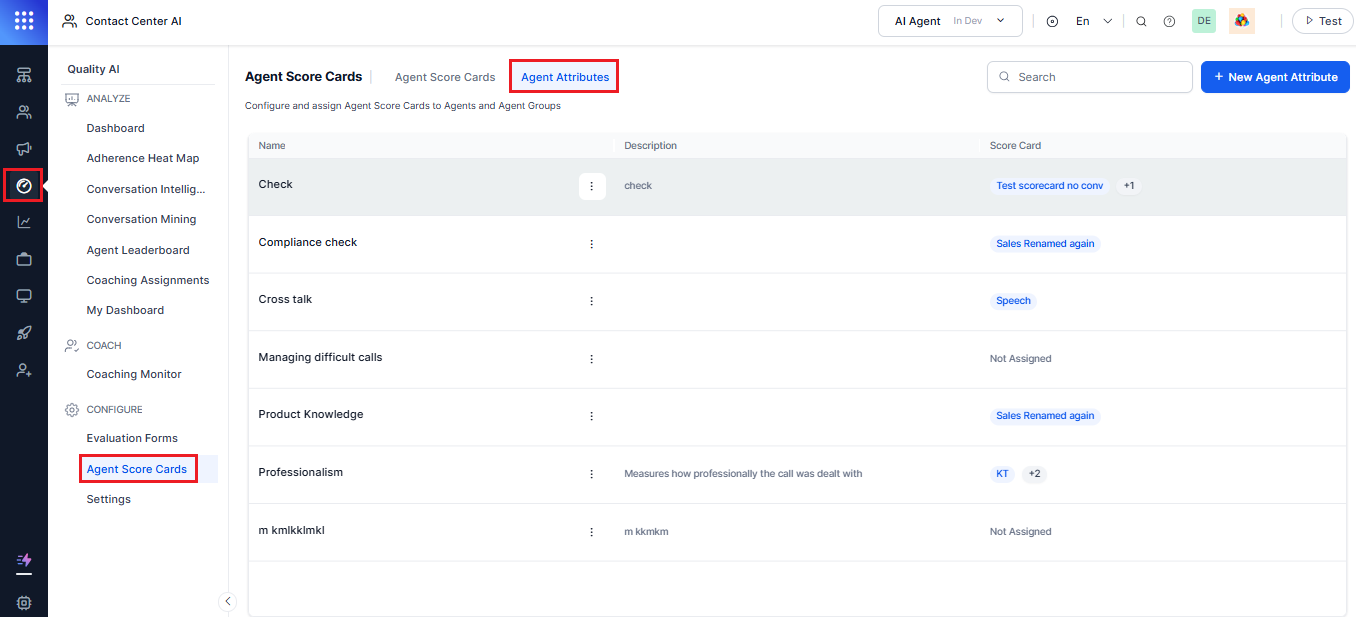 Users can view Agent Attributes by navigating to Quality AI > Configure > Agent Attributes.